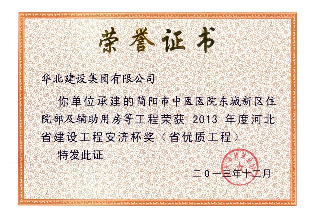 项目名称:2013年度简阳市中医医院东城新区住院部及辅助用房等工程河北省建设工程安济杯奖(省优质工程)证书