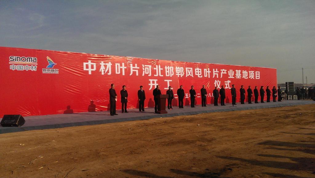 12月18日上午,我公司总承包的中材叶片河北邯郸风电叶片产业基地项目在冀南新区举行开工仪式。邯郸市委书记高宏志出席并宣布开工。市长王会勇致辞。中国中材集团有限公司总经理李新华,集团公司总经理王旭,市领导曹子玉、刘德明出席活动。