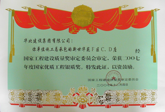 我单位施工的新世华苑F区C、D座荣获2007年度国家优质工程,今天在人民大会堂发奖