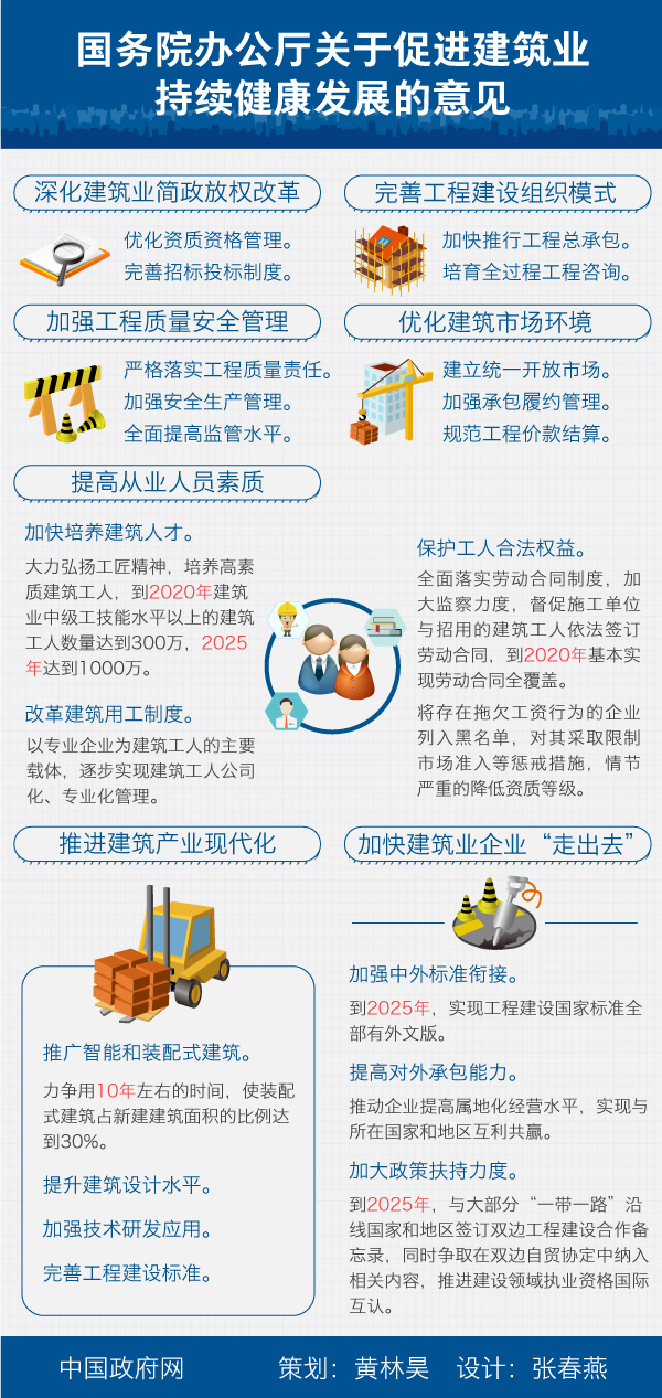 建筑业是国民经济的支柱产业。改革开放以来,我国建筑业快速发展,建造能力不断增强,产业规模不断扩大,吸纳了大量农村转移劳动力,带动了大量关联产业,对经济社会发展、城乡建设和民生改善作出了重要贡献。但也要看到,建筑业仍然大而不强,监管体制机制不健全、工程建设组织方式落后、建筑设计水平有待提高、质量安全事故时有发生、市场违法违规行为较多、企业核心竞争力不强、工人技能素质偏低等问题较为突出。为贯彻落实《中共中央 国务院关于进一步加强城市规划建设管理工作的若干意见》,进一步深化建筑业“放管服”改革,加快产业升级,促进建筑业持续健康发展,为新型城镇化提供支撑,经国务院同意,现提出以下意见:
